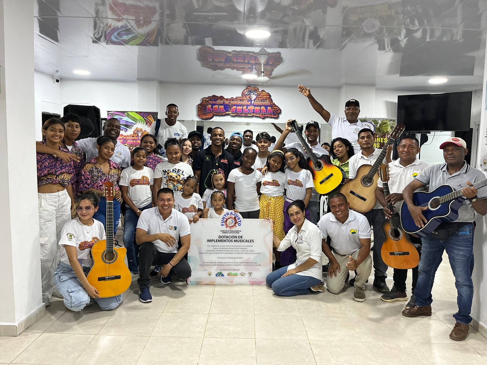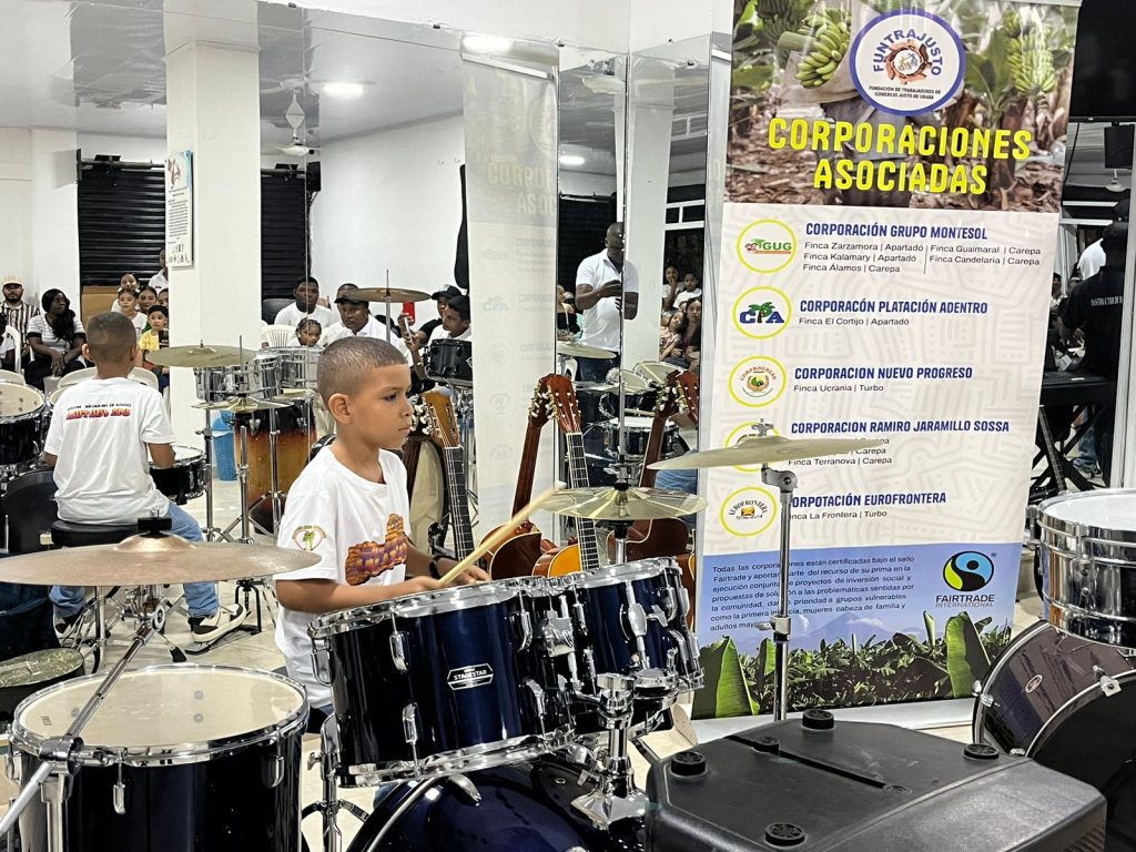 La Fundación de Trabajadores del Comercio Justo de Urabá (Funtrajusto) realizó una significativa entrega de donación a la Escuela de Formación Artística Son Cultura, ubicada en el municipio de Carepa. Este gesto, que refleja el compromiso social de las cinco corporaciones asociadas, fue posible gracias a los recursos de la prima Fair Trade, destinada a apoyar a los trabajadores bananeros de la región.